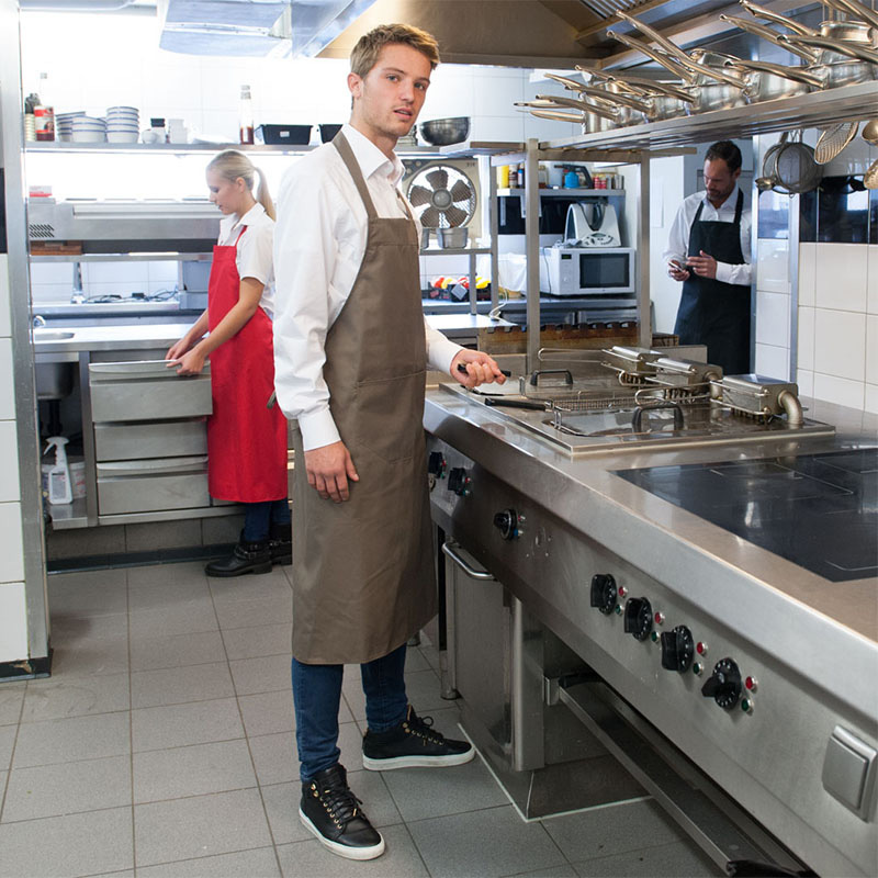 Brede halterschort van 100 cm met een dubbel opgestikte zak in twee delen. De langere lengte biedt extra bescherming en maakt hem zowel praktisch als stijlvol.